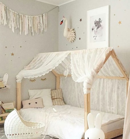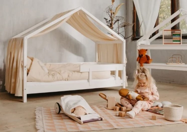 • Aizkari un baldahīni: Pievienojiet aizkarus vai baldahīnu, lai radītu noslēpumainu un mājīgu stūrīti. Tas arī sniegs bērnam privātuma sajūtu. Piemēram, YappyKids piedāvā dažādus aizkarus, kas lieliski saderēs ar gultu-mājiņu.