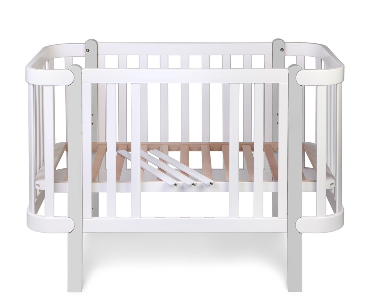 У кроватки регулируется дно по высоте, а также его можно поставить даже по диагонали, что эффективно помогает при простуде у малыша. Боковая сторона регулируется тоже. Можно приставить кроватку к родительской.
